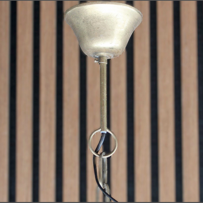 Die Deckenlampe wurde komplett aus Metall gefertigt und anschließend mit einer Patina im Vintage-Stil versehen.
