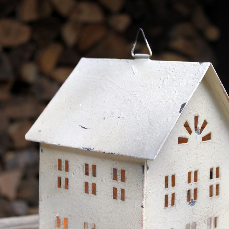 Das aus Metall gefertigte Zinkhaus verfügt über viele bezaubernde Details und ist deshalb auch unbeleuchtet ohne Kerzenschein ein dekoratives Wohnaccessoire für die Fensterbank oder Kommode.